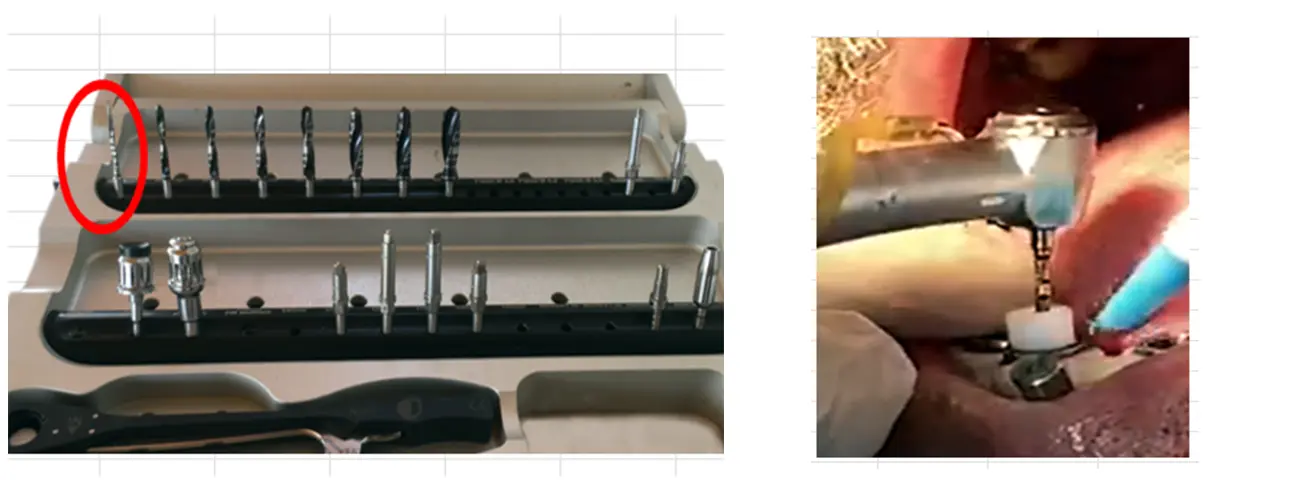 f) Kılavuz tekrar hasta ağzına yerleştirilerek vidalar ile sabitlenir. Yuvası açılacak implant için, protokol kartında gösterilen uyumlayıcı metal tüp içine yerleştirilir. Yine protokol kartında gösterilen frez, anguldruva uyumluyacıya oturana kadar girilir.